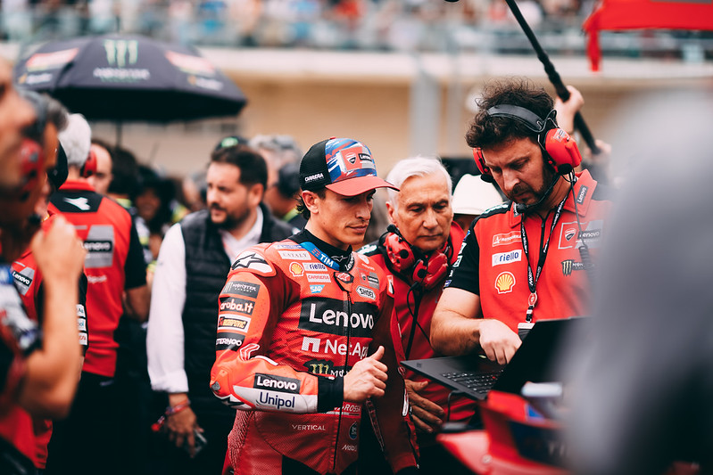 Merencanakan masalah. Marc Marquez membahas rencananya yang keliru untuk lari dari grid bersama timnya. Davide Tardozzi benar tentang aturannya. Dia tidak mendengarkan.
